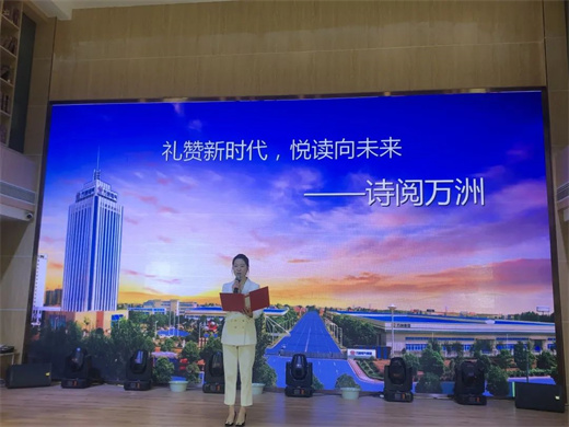 隨后,在大家熱烈的掌聲中,萬洲電氣行政部宣傳干事張紅云第一個走上舞臺,向大家展示獨具特色的萬洲企業文化。11首精妙絕倫的詩句,展示了萬洲電氣從無到有、從小到大的不凡歷程。“千磨萬擊還堅勁,任爾東西南北風”,張紅云聲情并茂的誦讀,或充滿艱辛,或慷慨激昂,或充滿力量,或信心昂揚,讓大家感受到萬洲電氣不畏艱難,不言放棄,篤定前行,創造奇跡的勇氣和力量!作為一名萬洲人,要愛讀書,多讀書,讀好書,共同建設更有文化底蘊的萬洲電氣,張紅云用激情和自信演繹了萬洲企業文化的無限魅力,贏得了現場觀眾的熱烈掌聲。
