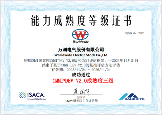 近日,萬洲電氣取得CMMI研究院頒發(fā)的CMMI3級認(rèn)證證書,標(biāo)志著萬洲電氣的軟件研發(fā)能力成熟度已達(dá)到國際水準(zhǔn)。