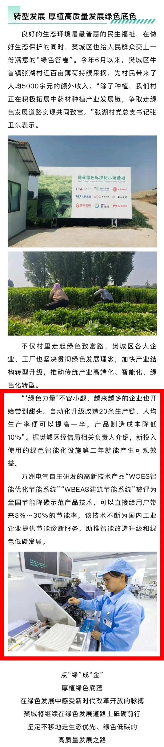 “‘綠色力量’不容小覷,越來越多的企業也開始嘗到甜頭。自動化升級改造20條生產鏈,人均生產率便可以提高一半,產品制造成本降低10%”。據樊城區經信局相關負責人介紹,新投入使用的綠色智能化設施第二年就能產生可觀效益。