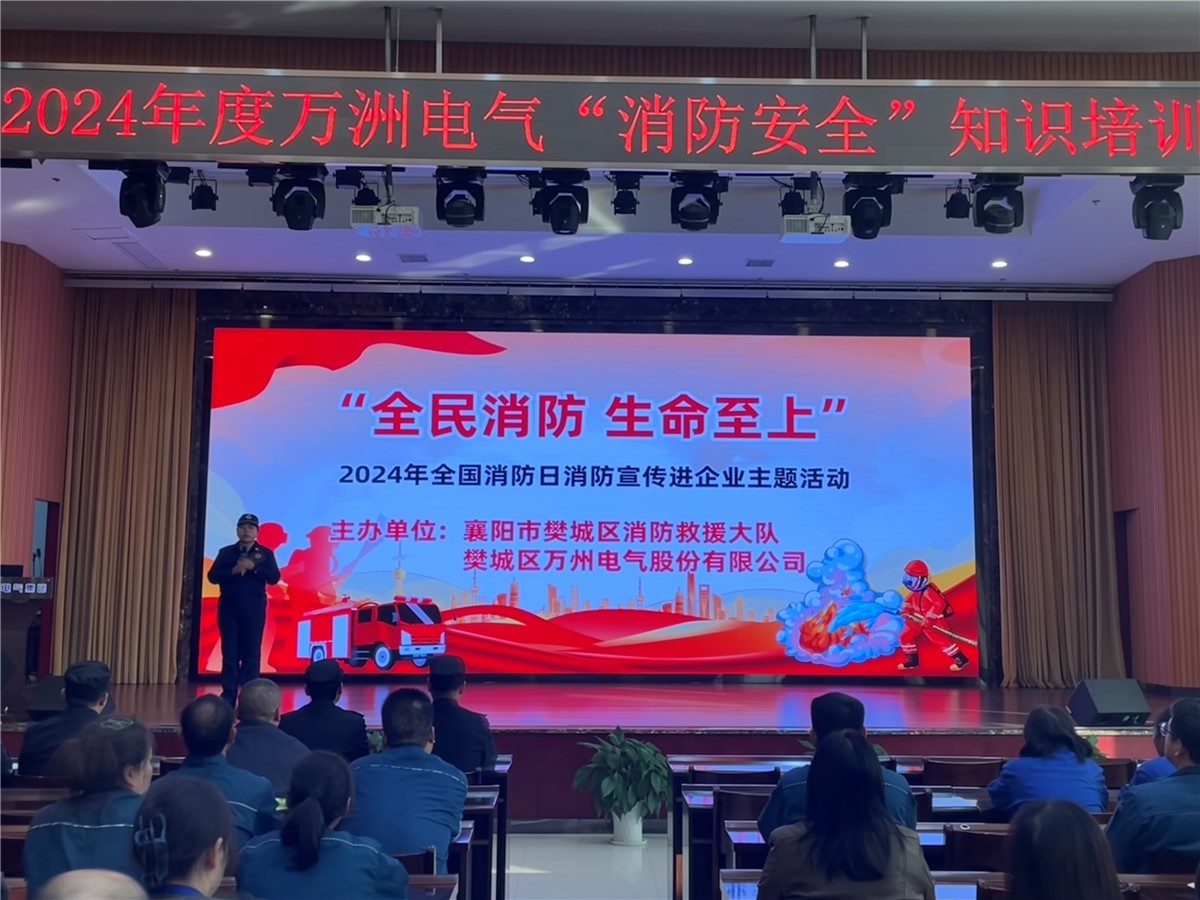 為增強員工消防意識,提高員工突遇火災等緊急情況的處置能力。11月8日下午,萬洲電氣專門邀請樊城區消防救援大隊到公司開展消防知識培訓和救援演練活動,萬洲電氣、云川光電、萬洲機械、襄陽工廠各部門安全員、班組長、骨干等近五十人參加培訓。